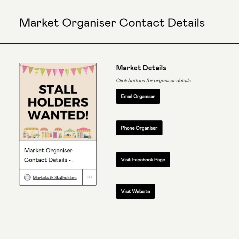 Market organiser contact details which will include one or more of email, phone, website or social media page details for the selected event.